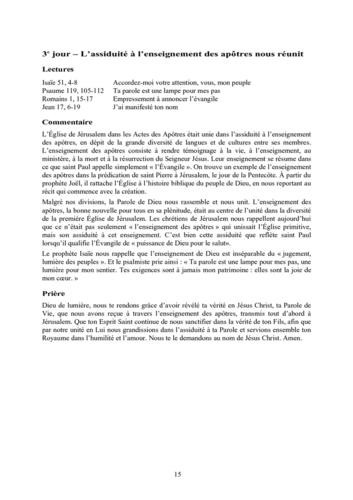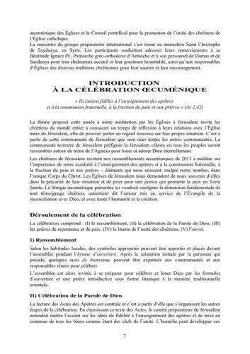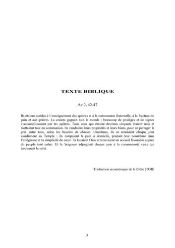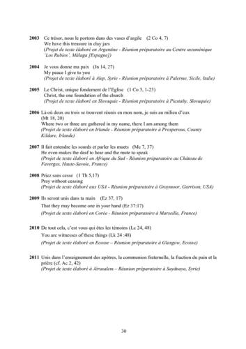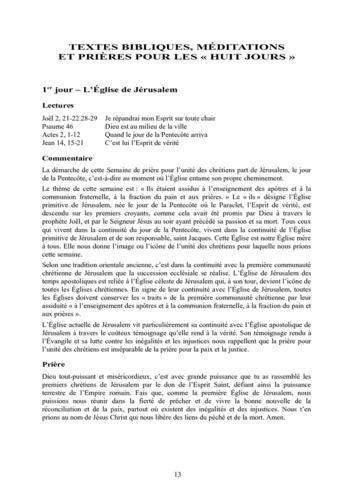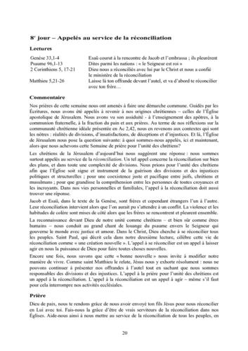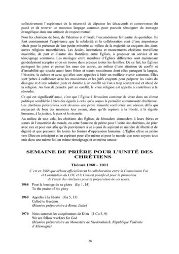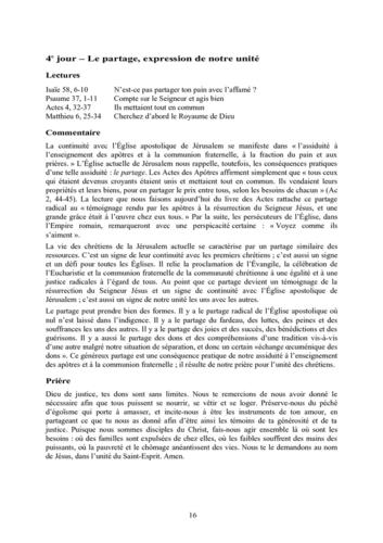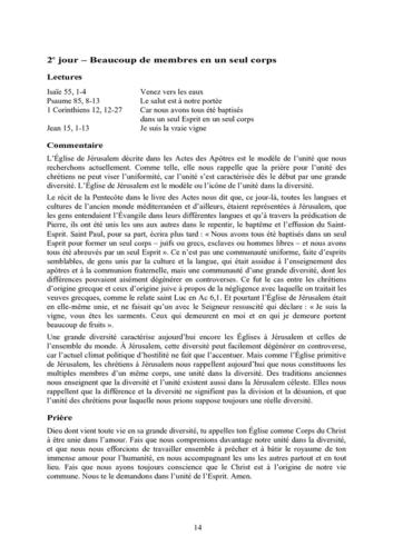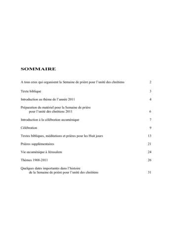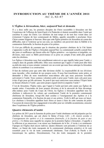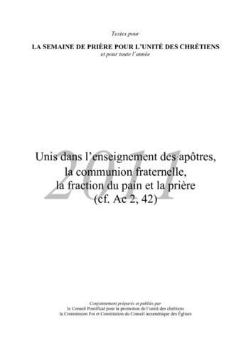 Le Conseil œcuménique des Églises (Genève) et le Conseil pontifical pour la promotion de l’unité des chrétiens (Rome) ont confié la préparation de la Semaine de prière pour l’unité chrétienne 2011 aux églises chrétiennes de Jérusalem. Celles-ci ont choisi le thème d’Actes 2,42 : « Ils étaient assidus à l’enseignement des apôtres et à la communion fraternelle, à la fraction du pain et aux prières. » Ce thème nous rappelle les origines de la première Église à Jérusalem ; il appelle à la réflexion et au renouveau, à un retour aux fondements de la foi ; il invite à se remémorer l’époque où l’Église était encore indivise. Quatre éléments sont présentés à l’intérieur de ce thème ; ce furent des traits marquants de la communauté chrétienne primitive et ils sont essentiels pour la vie de toute communauté chrétienne.