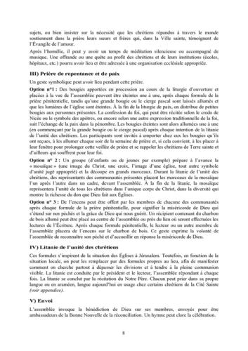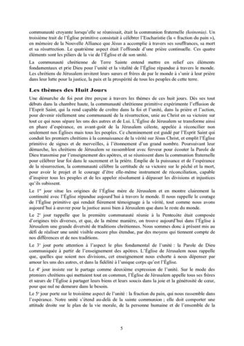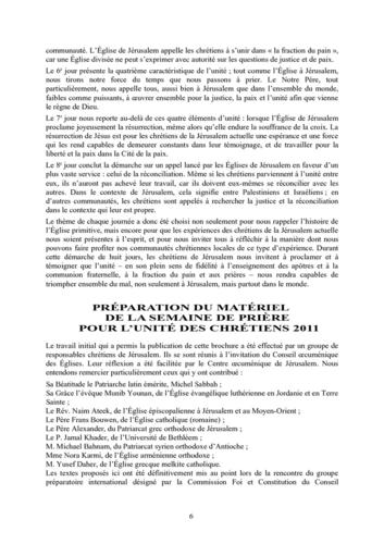 C’est de Jérusalem, l’Église mère, que l’appel à l’unité parvient cette année aux Églises du monde entier. Conscientes de leurs propres divisions et de la nécessité de faire davantage elles-mêmes pour l’unité du Corps du Christ, les Églises à Jérusalem appellent tous les chrétiens à redécouvrir les valeurs qui constituaient l’unité de la première communauté chrétienne de Jérusalem, lorsqu’elle était assidue à l’enseignement des Apôtres et à la communion fraternelle, à la fraction du pain et aux prières. Voilà le défi qui nous est lancé. Les chrétiens à Jérusalem appellent leurs frères et sœurs à faire de cette semaine de prière l’occasion de renouveler leur engagement à travailler pour un véritable œcuménisme, enraciné dans l’expérience de l’Église primitive.