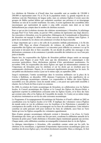 La communauté chrétienne de Terre Sainte entend mettre en relief ces éléments fondamentaux et prie Dieu pour l’unité et la vitalité de l’Église répandue à travers le monde. Les chrétiens de Jérusalem invitent leurs sœurs et frères de par le monde à s’unir à leur prière dans leur lutte pour la justice, la paix et la prospérité de tous les peuples de cette terre.